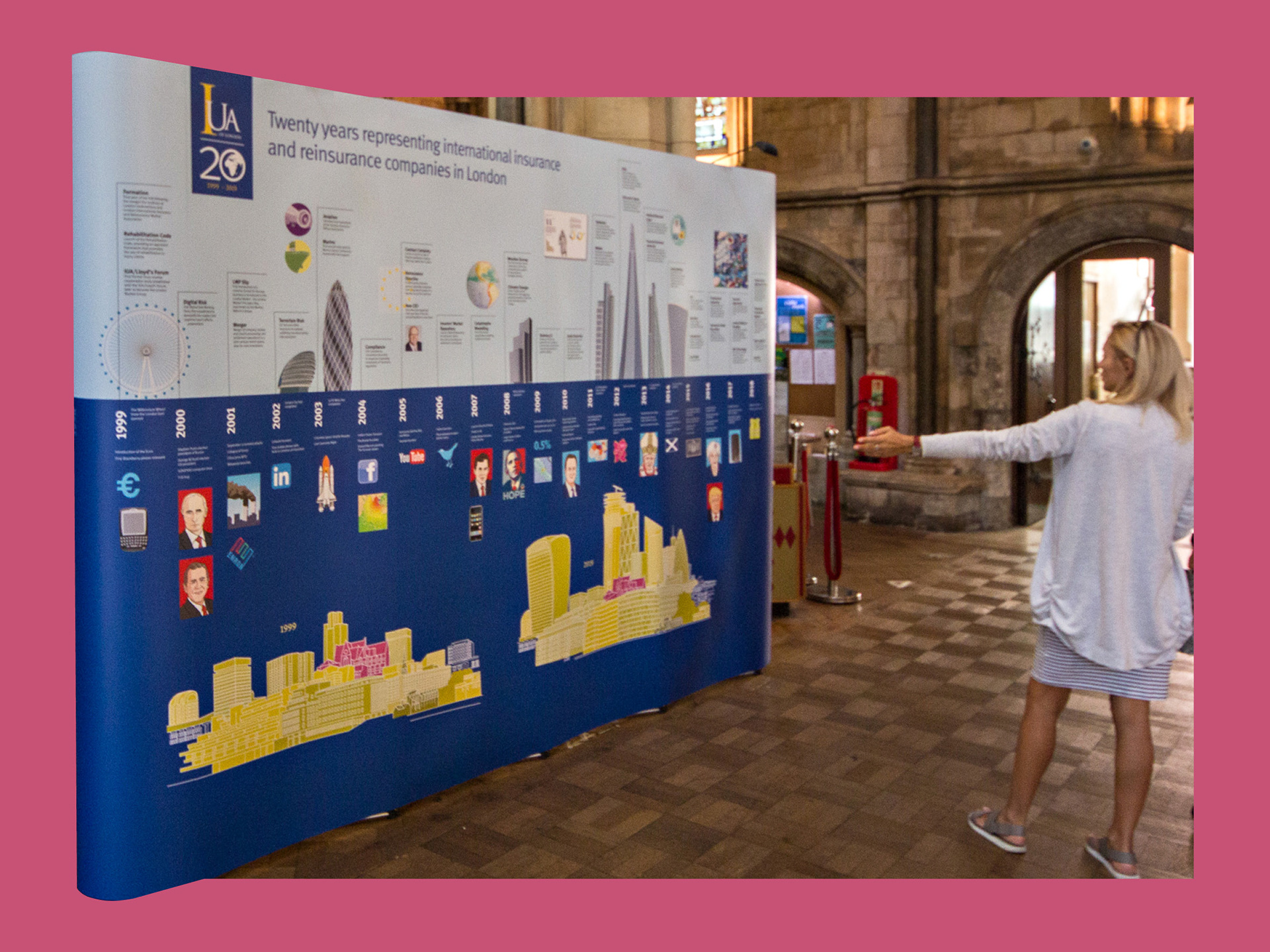 Lesage Design created a timeline to celebrate the 20th anniversary of the International Underwriting Association using bespoke illustrations of world events and buildings constructed in London over the same period. This timeline was used on a document (above) and a large banner (below).